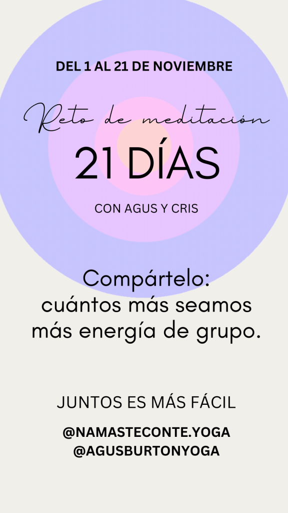 Del 1 al 21 de noviembre, una meditación guiada grabada por semana para que practiques cuando quieras. Nos acompañamos en un grupo de Telegram. Escríbeme por Instagram para sumarte al reto @agusburtonyoga